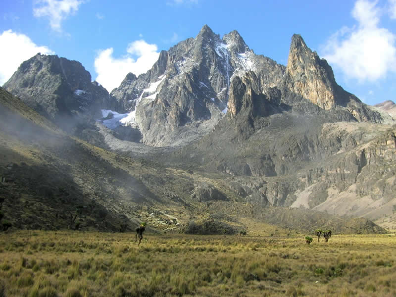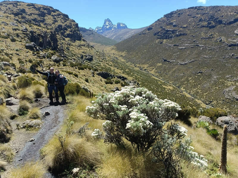 The journey begins on the Chogoria side, where rolling hills and forested valleys give way to towering cliffs, waterfalls, and crystal-clear alpine lakes such as Lake Ellis and Lake Michaelson. As the trail rises toward the high moorlands, trekkers are rewarded with sweeping views of the Gorges Valley and the rugged spires of Mount Kenya’s peaks.